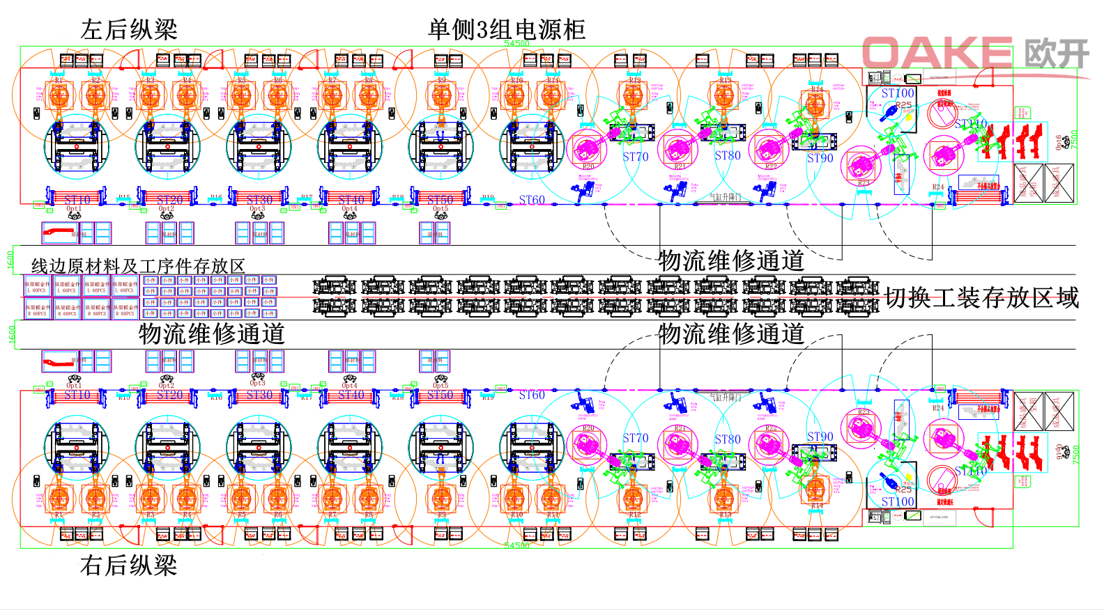 縱梁及門檻自動化生產線集成了點焊、弧焊、激光檢測等技術。縱梁線定位焊接工位采用機器人+轉臺布局的方式,補焊工位采用搬運機器人+固定焊鉗落地補焊方式,工位之間縱梁半成品均采用機器人自動裝取件及搬運。生產線可通過轉臺快換夾具接口快速實現夾具切換,兼容縱梁類多車型產品的自動化生產。